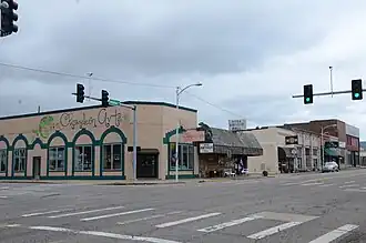 The Mena Commercial Historic District encompasses the historic downtown area of Mena, Arkansas, the county seat of Polk County in western Arkansas. The district extends along Mena Street between Port Arthur and Gillham Avenues, extending a short way to the south on Sherwood Avenue, opposite the railroad tracks for which the town's existence is responsible. Mena was founded as a major railroad service town for the Kansas City, Pittsburg and Gulf Railroad, as its site was located midway between Port Arthur, Texas and Kansas City, Missouri. The railroad located a major service yard here, and the town grew up around it. Most of its commercial center was developed between 1896 and 1940, with a variety of one and two-story commercial brick buildings in typical early 20th-century styles. The district, listed on the National Register of Historic Places in 2009, includes four properties previously listed separately: the railroad station, Mena City Hall (a repurposed 1917 post office building), the former Elks Lodge, and the former Studebaker Showroom.[2]