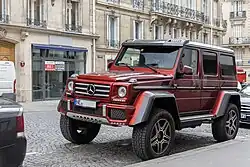 The Mercedes-Benz G500 4×4² (or G550 4×4² in the United States and Canada) is a special edition of the W-463 Mercedes-Benz G-Class (1990–2018), built with portal gear axles and much larger wheels and tires, for greatly increased off-road capability. In production since 2015, the model combines the body of a regular long-wheelbase Mercedes G-Class with the portal axles with hub gearing of the much larger Mercedes-Benz G63 AMG 6x6.[1] In addition to the greatly increased ground clearance, the G500 4×4² version has a significantly wide track than regular G-Class models.[2]
