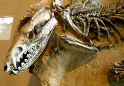 Morphological and species diversity of metatherians in Laurasia remained low in comparison to eutherians throughout the Cenozoic.[11] The two major groups of Cenozoic Laurasian metatherians, the opossum-like herpetotheriids and peradectids persisted into the Miocene before becoming extinct, with the North American herpetotheriid Herpetotherium, the European herpetotheriid Amphiperatherium and the peradectids Siamoperadectes and Sinoperadectes from Asia being the youngest Laurasian non-marsupial metatherians (with marsupials invading North America during the Pliocene-Pleistocene as part of the Great American interchange).[12][10] Metatherians first arrived in Afro-Arabia during the Paleogene, probably from Europe, including the possible peradectoid Kasserinotherium from the Early Eocene of Tunisia and the herpetotheriid Peratherium africanum from the Early Oligocene of Egypt and Oman. The youngest African metatherian is the possible herpetotheriid Morotodon from the late Early Miocene of Uganda.[13][14]