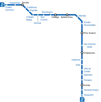 Line 2 was the second line in the system to open, in 1970. After two expansions, the line has 24 stations, (the most number of stations on a line in the entire metro network), over a total track length of 23.431 km (14.559 mi), of which 20.713 km (12.870 mi) are passenger track. The line has a general northwest–south direction passing through the city center and its color is blue. It starts at the border of the Federal District and the State of Mexico and ends in the city south.