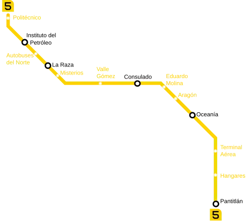 The first section of line 5 was opened in 1981, and it has been expanded twice to bring the total extension of this line to 13 stations over 15.675 km (9.740 mi) of track, of which 14.435 km (8.969 mi) are passenger track. The line has a general north-west to south-east direction relative to the city center and its color is yellow. This line previously had the NM73 trains but due to the introduction of the NM-02 trains in Line 2 now it is served by NC-82 Canadian trains made by Bombardier. Line 5 runs to Mexico City International Airport (Terminal Aérea station).