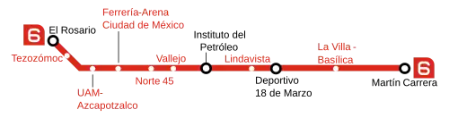 The line has only one surface station, the El Rosario terminal, while the rest of the line runs underground. Four stations connect with other metro lines. Line 6, like line 4, is also served by customized six-car trains.