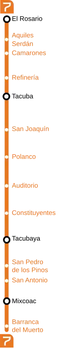 Transfer with other Metro lines is available at Tacubaya (lines 7 & 9), Balderas (line 3), Salto del Agua (Line 8), Pino Suárez (line 2), Candelaria (line 4), San Lázaro (line B) and Pantitlán (lines 5, 9 & A). Transfer to the Metrobús bus rapid transit (BRT) system is available at Tacubaya (line 2), Insurgentes (line 1), Cuauhtémoc (line 3), Balderas (line 3), Pino Suárez (line 4) and San Lázaro (lines 4 & 5).