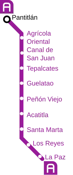 Line A was the second metro line that extended into the suburbs of Mexico City outside the Mexican Federal District. Opened in its entirety in 1991, it comprises ten stations over 17.192 kilometres (10.683 mi) of track, of which 14.893 kilometres (9.254 mi) are passenger track. Line A runs in a general south-east direction, east of the city center, and its color is purple.