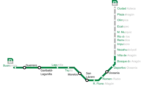 Line B became the third line to extend into the suburbs of Mexico City, and into the State of Mexico. The first section of the line was opened in 1999 and was expanded once to comprise a total of 21 stations over 23.722 km (14.740 mi) of track, of which 20.278 km (12.600 mi) are passenger track. Line B starts north of the city center and runs in a general north-east direction relative to it. Its color is green on silver.