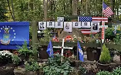 A grove of ten scarlet oak trees (Quercus coccinea) was planted on 30 November 1969 as replacement trees to honour the crew,[1][2] and on the same day a pair of memorial plaques attached to a large boulder were unveiled in a ceremony attended by the Lord Mayor of Sheffield, Alderman Daniel O'Neill; the Bishop of Sheffield, John Taylor, and Major General John Bell, Commander of the 3rd US Air Force in Britain.[2][3] Since 2018, local man Tony Foulds has maintained the memorial, which for many years had been cared for by local military cadets, alongside the parks department, and Friends of Porter Valley. Mr Foulds' caretaking involves sweeping the path and watering the flowers in the Memorial Garden, which were all donated by garden centres and well-wishers.