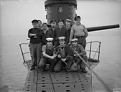 Crawford (centre), 1st lieutenant, Lieut. R. T. Sallis, and other members of the crew of Unseen display their Jolly Roger, 31 January 1944, Portsmouth
