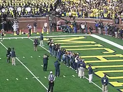Michigan has played its home games at Phyllis Ocker Field Hockey Field since its construction in 1995. The field is named after Phyllis Ocker, a former University of Michigan teacher, field hockey coach, and athletics administrator. In 2003, Ocker Field's AstroTurf playing surface was upgraded at the cost of $500,000.[7] Between the end of the 2013 season and the start of the 2014 season, Ocker Field underwent substantial renovations that included the installation of a blue AstroTurf 12 playing surface and a permanent 1,500-seat grandstand, which tripled the stadium's capacity.[7] In 2017 Ocker Field received a new playing surface with the installation of a Poligras Platinum CoolPlus field. Between the 2003 and 2014 renovations, the stadium had a seating capacity of 500.[8] Before the construction of Ocker Field, the Michigan field hockey team had played at four other venues on campus: Michigan Stadium (1973–75), Ferry Field (1976–86), the Tartan Turf (1987–90), and Oosterbaan Fieldhouse (1991–94).[8]