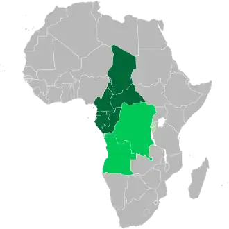 Central Africa (French: Afrique centrale; Spanish: África central; Portuguese: África Central) is a subregion of the African continent comprising various countries according to different definitions. Middle Africa is an analogous term used by the United Nations in its geoscheme for Africa and consists of the following countries: Angola, Cameroon, Central African Republic, Chad, Democratic Republic of the Congo, Republic of the Congo, Equatorial Guinea, Gabon, and São Tomé and Príncipe. The United Nations Office for Central Africa also includes Burundi and Rwanda in the region, which are considered part of East Africa in the geoscheme.[1] These eleven countries are members of the Economic Community of Central African States (ECCAS).[1] Six of those countries (Cameroon, Central African Republic, Chad, Equatorial Guinea, Gabon, and Republic of the Congo) are also members of the Economic and Monetary Community of Central Africa (CEMAC) and share a common currency, the Central African CFA franc.[2]