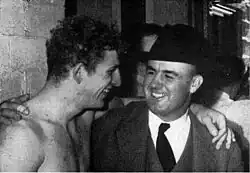 Pitt football head coach "Mike" Milligan (right) congratulates Nick Bolkovac after a 7-0 shut out of undefeated Penn State on November 20, 1948. In the fourth quarter, Bolkovac scored the winning touchdown when he intercepted a pass and returned it from the 23 yard line. Bolkovac also prevented a tying score on the last play of the game by stopping Penn State fullback Fran Rogel at the Pitt one yard line.[13]