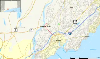 ![]() Map of New Haven County in southern Connecticut with Milford Parkway highlighted in red | |