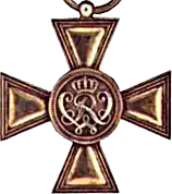 The Military Merit Cross (German: Militär-Verdienstkreuz) was the highest bravery award of the Kingdom of Prussia for non-commissioned officers and enlisted soldiers. It was also known as the Golden Military Merit Cross (Goldenes Militär-Verdienstkreuz) to distinguish it from the Military Decoration 1st Class (Militär-Ehrenzeichen I. Klasse), a lesser Prussian enlisted bravery decoration which was an identical cross but in silver. The Military Merit Cross came to also be known as the "Pour le Mérite for non-commissioned officers and enlisted men" (Orden Pour le Mérite für Unteroffiziere und Mannschaften), after the Pour le Mérite, Prussia's highest military decoration for officers.