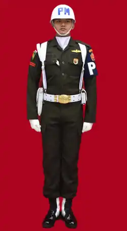 The uniforms worn by the Military police are different for the three unit branches. The Army Military Police wear dark green, the Navy Military Police wear blue-gray and the Air Force Military Police wear light blue. The beret of the three Military police corps of Indonesia is the same which is blue, dragged to the left with the Military police symbol on the right side when worn. Military policemen are identifiable by their white belts, white lanyards, white helmets, and brassard worn on their upper left sleeve imprinted the word "PM".