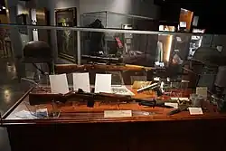 Murphy was initially assigned to the Intelligence Office headquarters, 1st Battalion, 141st Infantry as S-2, and attended the Guard's two-week summer training at Fort Hood as a range officer.[137] 19 December 1950, Murphy was transferred to division headquarters as an aide to Ainsworth.[138] At the 1951 summer training camp at Fort Polk, Louisiana, Murphy was in charge of training approximately 500 inexperienced new recruits in bayonet, marksmanship and close order drill.[139] Fellow instructor Captain Tom Berry remembered, "In my opinion, Audie Murphy set the tone for the obvious high esprit de corps for the 36th Division which lasted throughout my association with the Division [eighteen years]. Audie Murphy walked the way he talked."[140]