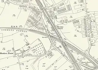 The railway line was built by the Edgware, Highgate and London Railway (EH&LR) and was opened on 22 August 1867, in what was then rural Middlesex, by the Great Northern Railway (GNR) (which had taken over the EH&LR). The station, then named The Hale Halt, was not opened until 11 June 1906, on the single track from Finchley Central to Edgware.[1] The whole line ran from Finsbury Park to Edgware via Highgate with branches to Alexandra Palace and High Barnet. The station was adjacent to the Midland Railway's (MR's) Mill Hill station (now Mill Hill Broadway), with the GNR's track passing under those of the MR just to the south of Mill Hill station. A goods service opened on 18 July 1910.[1]