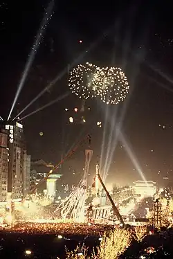 Japan and South Korea hosted a joint millennium celebration. In Tokyo, there was a series of concerts, which included the 50th edition of NHK Kōhaku Uta Gassen at the NHK Hall[12] and Johnny's Countdown Live at the Tokyo Dome, as well as a fireworks display. At midnight, temple bells across Japan were rung 108 times to "dispel the evils of mankind".[4]