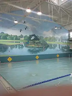 The park is centered on the Miller/Knox lagoon which is depicted on a large 200 foot by 50 foot mural at the Richmond Municipal Natatorium nearby. The park affords panoramic views of the Bay Area especially the Oakland and San Francisco skylines, islands, bridges, and the North Bay mountains. The views are the farthest from the park's high point: Nicholls Knob. The regional shoreline includes Keller Beach on San Pablo Bay in addition to large picnic and barbecue areas, parking and a fishing pier. There is also a former train ferry pier at Ferry Point and other assorted ruins. The park is also home to the Golden State Model Railroad Museum.