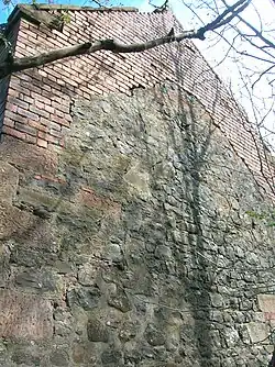 A wooden breast wheel with steel gearing was still in use up until 1884 when improvements included a new iron overshot wheel with gearing for one pair of stones. The set proved less than satisfactory, and in 1902 the whole machinery was replaced. The wheel was removed and a Hercules water turbine was installed with a belt drive. It operated at speed of 450 revolutions and if the gate was fully opened moved 600 cubic feet of water per minute through a single pipe of 21 in. diameter.[1] The changes are very apparent in the gable ends and side walls where the enlargements to the mill were built with brick.