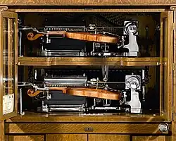 The Violano-Virtuoso was not available to the public until 1911.[33] Technology used in the instrument was patented on 4 June 1912, under United States patents 1,028,495[34] and 1,028,496.[35] Early Violan-Virtuoso's have a glass divider between the violin mechanism and the piano mechanism. Machines with two violins are known as the De Luxe Model Violano-Virtuoso or the Double Mills.