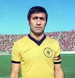 Papaioannou was an emblematic and the most effective leader of the club who led them to five Championships and three Cups, including a domestic double in 1978. He has been for AEK and Greek football a symbol of morale and loyalty to the team, as staying with the same team for over a decade and never seeing a red card in his entire career, while he was marked with a yellow card only three times.[81] In his 17-year spell with AEK, he became the club's all-time top scorer and by the time he left AEK he was also the league's all-time top scorer, a record broken 11 years later by Mavros. Papaioannou today is the 3rd place of the all-time top scorers of the Greek Championship.[82] He holds the club record of most goals scored in the derbies against Panathinaikos with 10 goals,[83] while he is second, behind Mavros at the same record in the derbies against Olympiacos with 14 goals.[84] He was the player with the most appearances in all official competitions with the double-headed eagle, until he was surpassed by Stelios Manolas, however Papaioannou holds record of the games played in league with 480 appearances.[85] Until today, he is sixth in appearances for the Greek Championship.[86]
