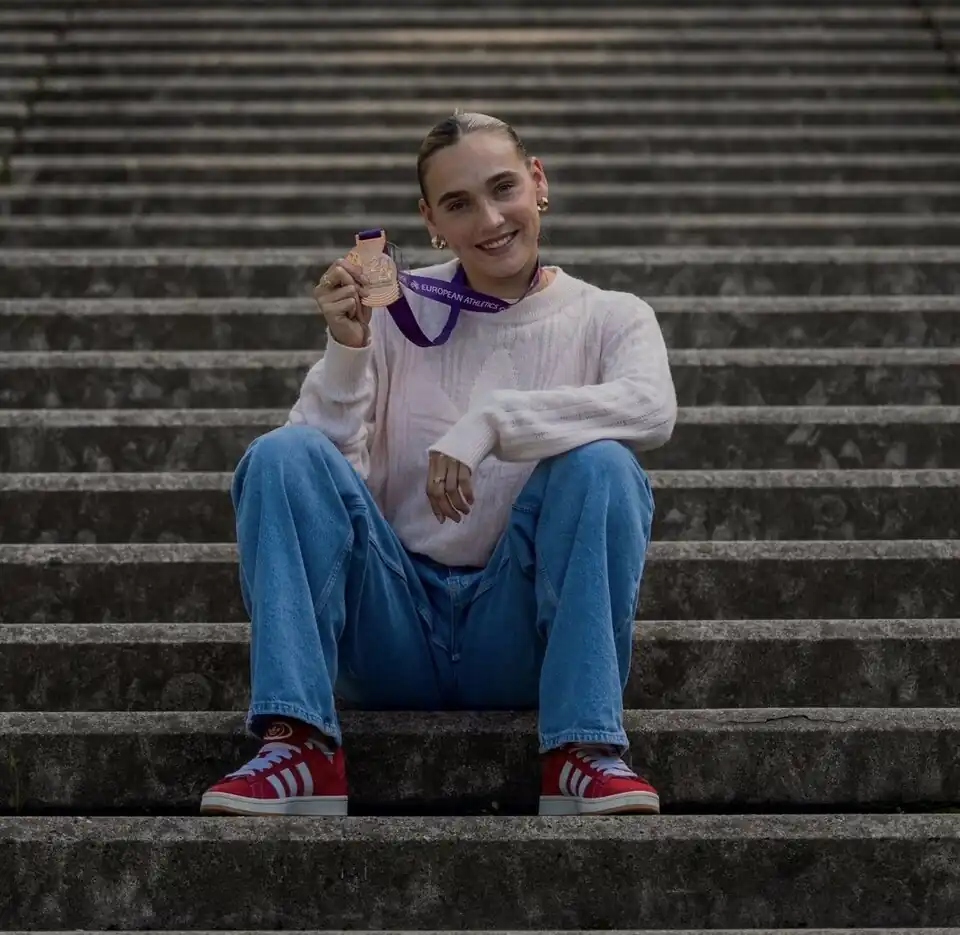 Bisschops with her bronze relay medal from the 2024 European Championships