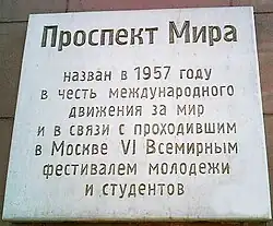 6. ^ See the plaque above. "назван в 1957 года в честь международное движения за мир и в связи с проходившим в москве..." (Named in 1957 in honor of the International Peace Movement due to take place in Moscow")