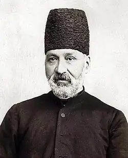 Nasrollah Pirnia, also known as Mirza Nasrollah Khan (Persian: میرزا نصرالله خان نائینی; 17 October 1840 – 13 September 1907, titled Moshir al-Dowleh), was the first Iranian Prime Minister. He became Premier of Iran following the introduction of the Persian Constitution of 1906, establishing Iran's first legitimate government approved by the Majlis on 7 October 1906. Before becoming Prime Minister, he had served as the Minister of Foreign Affairs. He died in circumstances said to be suspicious and was buried in Imamzadeh Saleh of Tajrish.