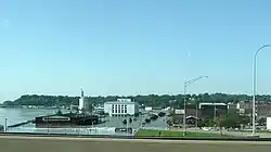 River stages at the Quad Cities of Iowa and Illinois were above major flood stage for 51 days exceeding the previous record of 31 days set in 2001.[23] The river remained above flood stage levels for over 96 days.[24] The crest of 22.7 feet (6.9 m) on 2 May 2019 was nearly a tenth of a foot above the record stage set in 1993. Temporary flood barriers failed on 30 April 2019 flooding portions of downtown Davenport, Iowa.[23][25][26]