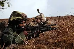 The mitznefet (Hebrew: מִצְנֶפֶת) is a helmet covering used by the Israel Defense Forces since 1994. It is considerably larger than the helmet worn by infantry soldiers.[1] The main purpose of the covering is to break up what would otherwise be the distinctive outline of a helmeted human head, while also preventing light from reflecting off the wearer's helmet for a tactical advantage, making it easier to camouflage when necessary.
