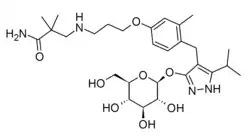 • 2,2-dimethyl-3-[3-[3-methyl-4-[[5-propan-2-yl-3-[(2S,3R,4S,5S,6R)-3,4,5-trihydroxy-6-(hydroxymethyl)oxan-2-yl]oxy-1H-pyrazol-4-yl]methyl]phenoxy]propylamino]propanamide