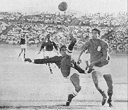 Amin clearing the ball with a bicycle kick from Iranian Hamid Shirzadegan during the second leg of the 1964 Summer Olympics qualification