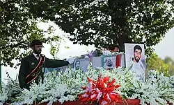 A funeral procession was held for Hojaji in the Iranian capital, Tehran, on September 27, 2017. Thousands of people took to the streets for his funeral.[15] The funeral began from the Imam Hussein square in downtown Tehran. Ali Khamenei prayed over Hojaji's casket and spoke to his family, praising their fortitude.[16] Many Iranian artists memorialized his death in videos and paintings.[17][18]