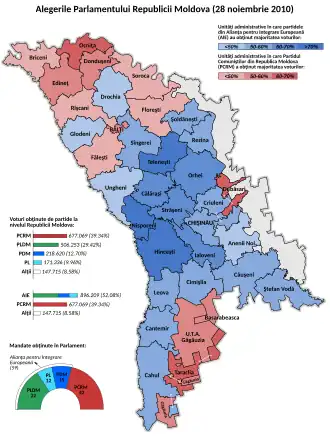 - ^ "Exit-Poll PublikaTV/IRES: PLDM - 34.4% ; PCRM - 26% ; PDM - 15.1% ; PL 15.6%" (in Romanian). Unimedia. 2010-11-28. Retrieved 2010-11-28.