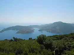 The main town of the island, Vathy, is situated on a branch on the southeastern side of the gulf.[1] There are two uninhabited islets in the gulf: Lazareto and Skartsoumponisi.