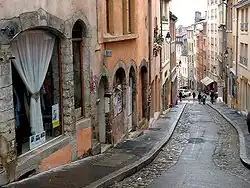 In the Middle Ages, this street was still a country path already taken during the prehistoric times, bordered by agricultural land, including vineyards. The nuns of the desert bought the western part in 1296 and decided to change the route in a street several centuries later. It was urbanized in the 16th century. Then, from the 16th century, it became a major axis of entry and exit from the Presqu'île by the North since the Porte Saint-Sébastien or La Croix-Rousse. Thus, the street was originally called Grand'Côte Saint-Sébastien and Grand'Côte de La Croix-Rousse.[1] The upper part of the street was named Pierres-Plantées[2][3] named after the planted stones installed in this area to reduce the dangerousness of the street, thus providing an insurmountable physical constraint.[4] In 1628, a small statue of Saint-Roch and a plaque in Latin, installed to indicate where the plague epidemic stopped, were added and finally removed after the French Revolution.[5]