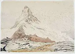 The Matterhorn was studied by Horace-Bénédict de Saussure in the late 18th century; this was followed by other renowned naturalists and artists, such as John Ruskin, in the 19th century. It remained unclimbed after most of the other great Alpine peaks had been attained and became the subject of an international competition for the summit. The first ascent of the Matterhorn was in 1865 from Zermatt by a party led by Edward Whymper, but during the descent, a sudden fall claimed the lives of four of the seven climbers. This disaster, later portrayed in several films, marked the end of the golden age of alpinism.[9] The north face was not climbed until 1931 and is among the three biggest north faces of the Alps, known as "The Trilogy". The west face, the highest of the Matterhorn's four faces, was completely climbed only in 1962. It is estimated that over 500 alpinists have died on the Matterhorn, making it one of the deadliest peaks in the world.[10]