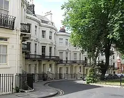 Ten pairs of "delightful" semi-detached villas, five on each side of the road, make up this mid-1840s development by Amon Henry Wilds.[37][116] They are in the Italianate style with influences of Regency architecture, and have two bow windows with bonnet-style canopies above, stuccoed walls with extensive rustication, prominently bracketed eaves and cast iron balconies.[37][116] The "charming" houses are set in spacious plots in a former bluebell wood.[37][65] The street was completed over the course of three years from about 1845.[65] All of the villas are listed buildings.[37]