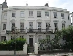 These three houses rise to three storeys and form a slightly outward-curving nine-bay composition whose outermost bays (containing the entrances for numbers 1 and 3) are recessed.[26] The curved effect is much less pronounced than in the centre of the crescent.[2] At first-floor level, a cast iron balcony supported on brackets spans the other seven bays.[26] The houses are topped by a parapet which is supported on a modillion cornice and which continues round the side elevation of number 1, which faces Clifton Hill.[26] Each house has a three-window range; those at first-floor level have architraves of various styles (flat cornices, curved pediments and triangular pediments), while at the top floor original sash windows survive. The doors, which are four-panelled and have decorative fanlights, are set in porches flanked by pilasters and topped by an entablature. The ground-floor walls are heavily rusticated. The roof has chimneys at the sides and is hidden behind the continuous parapet.[26]