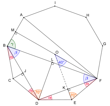 Regular nonagon with being the center of its circumcircle. Computing of the angles: