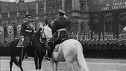 Marshal Georgy Zhukov receiving a report from Marshal Konstantin Rokossovsky during the parade.