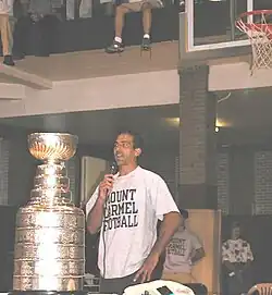 Chris Chelios visits Mount Carmel, displaying one of the Stanley Cups he won during his NHL career.