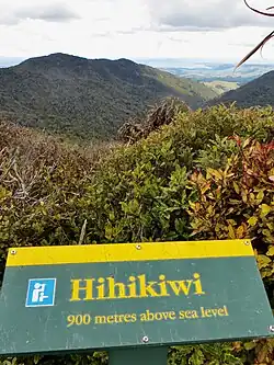 Hihikiwi Track (4–6 hr / 6.4 km (4.0 mi) km one way) climbs many steps in bush from Pirongia West Road, then rises further to an up and down ridge, to reach Hihikiwi Lookout (905 m (2,969 ft)), where there are views down the Ōpārau valley to Kawhia Harbour. From the lookout there is a boardwalk and steps down and up to the hut.[25][26]