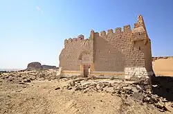 A large stone fort, Qalat Mudawwara, was constructed in the 18th century by the Ottoman administration to afford protection to the hajj pilgrims. There are references to a fortification at this site as early as the 9th and 16th centuries.[2] The first Western description of the fort is given by Charles Montagu Doughty in an account first published in 1888.[7] He describes Medowwara (sic) "...the kellat Medowwara, where we came to water. The place lies very desolate; the fort is built at a spring, defended now by a vault from the Beduin's hostility. We felt the noon here very sultry and the sun glancing again from the sand we were between two heats. ..."