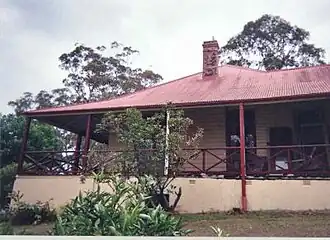 Mulholland's farm house is located on Lot 1 (area of 3 acres 6 roods 1/2 perch) located at the south-west corner of the Smyth's grant. Lot 1 had a water frontage to Brisbane Water, set back by the foreshore reservation of 100', and was bounded by reserved roads on the north (now Elfin Hill Road) and east. While some lots were sold at the time of the auction in 1882, Lot 1 was purchased from Sahl and Nobbs in November 1891 by Charles Thomas Sandon and William Hume for £96/8/11. Sandon later in the same month brought out Hume's interest and at the same time purchased the 100' reservation of land which separated Lot 1 from Brisbane Water. This area had been granted by purchase to Sahl and Nobbs in October 1890 after lobbying the government for rescission of the usual 100' high-water mark reservation. That reservation land became a functional part of the subsequent farm, and the boat shed, wharf, well, road and water pipeline were built on it.[1]