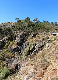 The park contains the 50-metre (164 ft) Lesmurdie Falls, formed by Lesmurdie Brook emptying over the Scarp, and the surrounding riparian and heath vegetation.[2] Wandoo, jarrah and marri trees can all be found within the park. A gravity hill exists near the carpark on Palm Terrace.