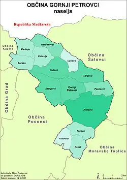 The Municipality of Gornji Petrovci (pronounced [ˈɡoːɾnji pɛˈtɾoːu̯tsi]; Slovene: Občina Gornji Petrovci) is a municipality in Slovenia. The seat of the municipality is the town of Gornji Petrovci. The municipality was established in its current form on 3 October 1994, when the former larger Municipality of Murska Sobota was subdivided into nine smaller municipalities.[2]