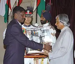 ![]() Dr. A.P.J. Abdul Kalam presenting the Dronacharya Award to the Hony. Captain M. Venu, VSM | |