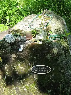 Roadside plaque near where Michelle's body was found. Visitors leave tokens such as beads and flowers on the boulder.
