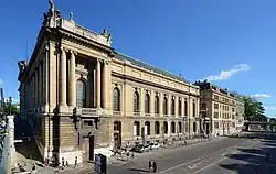 The façade is decorated with sculptures by Paul Amlehn: an allegory of the arts, depicting painting, sculpture, drawing and architecture, is mounted on the triangular gable above the entrance, and two more allegories, of archaeology and applied art, can be seen in the left- and right-hand corners of the building respectively. The upper frieze includes the names of Genevan artists: Dassier, Baud-Bovy, Saint-Ours, Agasse, Töpffer, Liotard, Calame, Diday, Menn, Petitot, Arlaud and Pradier.[2]