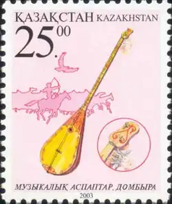 The most popular traditional instruments are string instruments. First of them is the dombra (домбыра), the most popular and the oldest Kazakh music instrument. Some argue that nomads have used similar two-string instruments more than two thousand years ago.[1] The dombra is a long-necked lute with two strings tuned in the interval of a fourth or sometimes a fifth. The strings are plucked or strummed by the right hand without a plectrum.